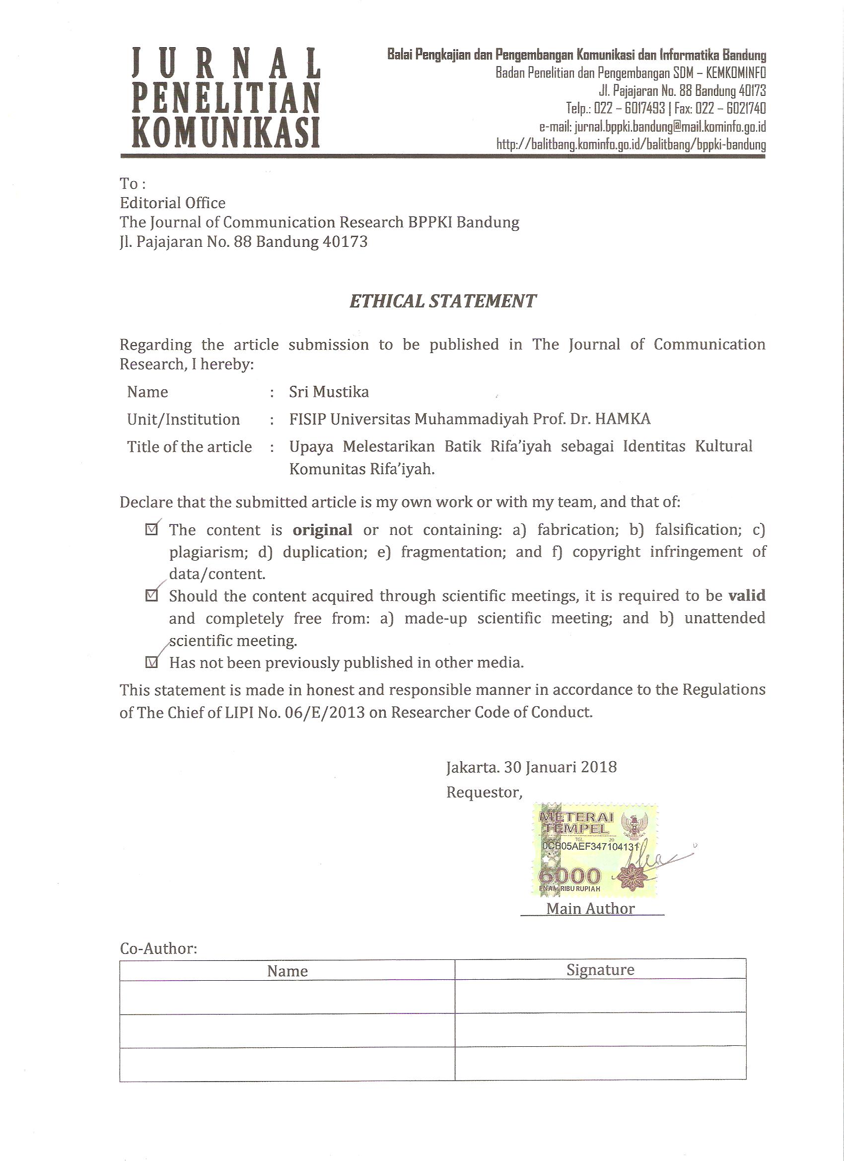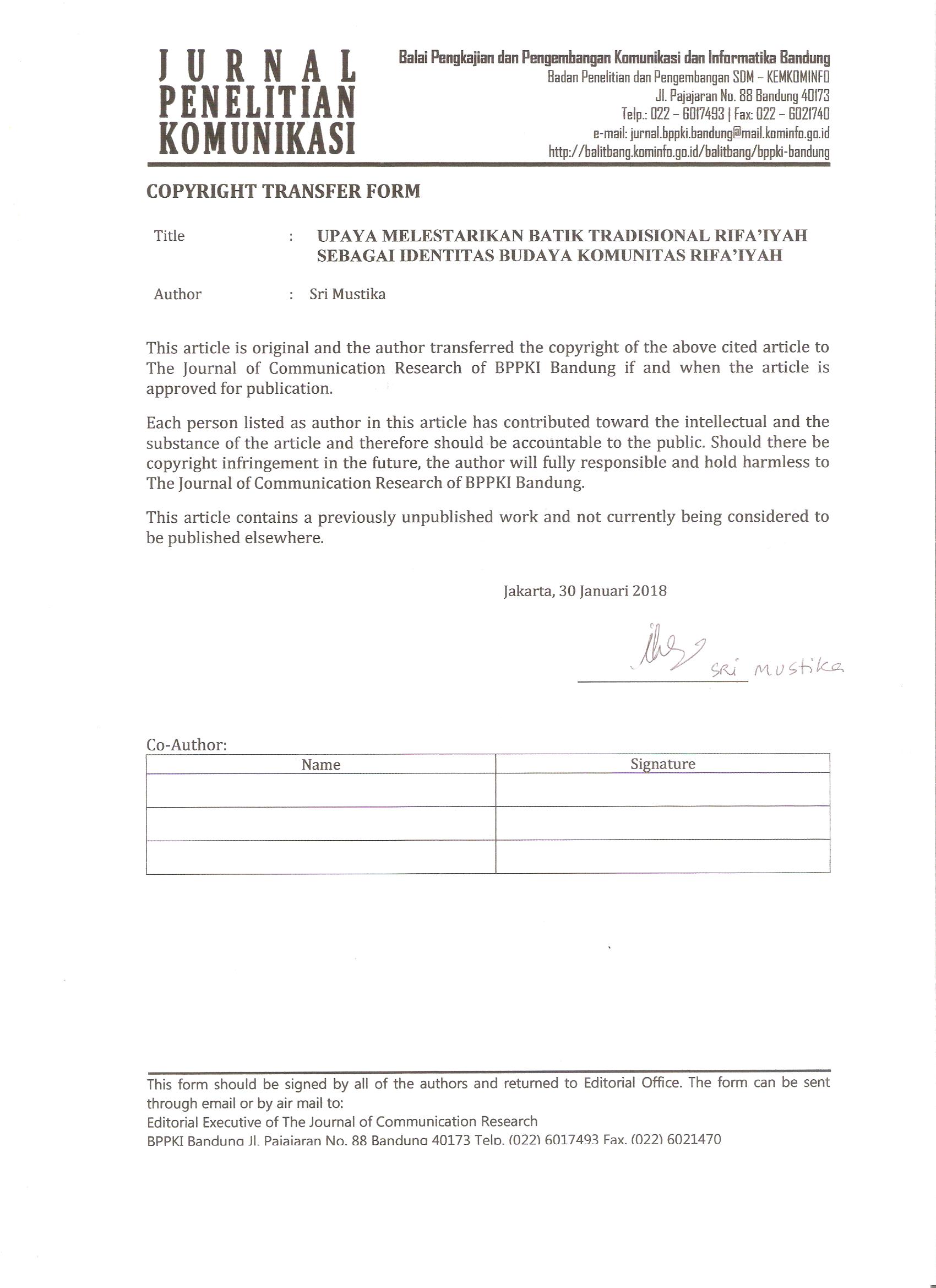 There are various types of batik in Indonesia. One of them is Rifa’iyah batik produced by Rifa’iyah community in Kalipucang Wetan, Batang, Central Java. It gets the strong influence of Islam. It is classical batik since the motifs persist from one generation to another generation. This research focuses on the preservation of batik as the cultural identity of Rifa’iyah community. By using the paradigm of constructivism, cultural identity theory, and methods of phenomenology, the researcher intends to understand the preservation effort of batik Rifa’iyah. Data were collected based on observation, in-depth interviews, and documentation study. Data analysis was done by coding system development technique. This study found that members of the batik Rifa’iyah community still admit batik as their cultural identity. But nowadays young batik artists have increasingly reduced, so it is feared that no one will preserve batik Rifa’iyah in the future. Various efforts to maintain it among others are by forming Rifa’iyah batik maker community serving as coordinating institution, organizing batik workshop for batik makers, attending batik exhibition, opening free batik class for elementary students, and motivating teenagers to appreciate batik as their cultural heritage.