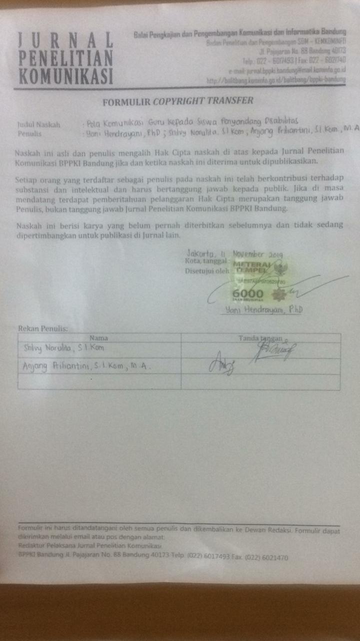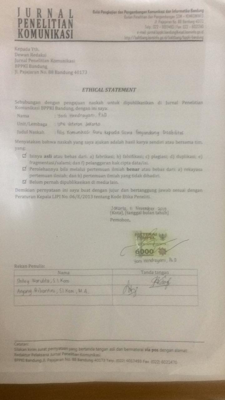 Lestari, Maya Puji, Naryoso, Agus, dan W.N.R. (2013) Memahami Pengalaman Komunikasi Antar Pribadi Orang Tua, Guru, dengan Anak Tunawicara dalam Menanamkan Nilai Prososial dan Antisosial di Masyarakat. Interaksi Sosial. 1 (3), 1–13.