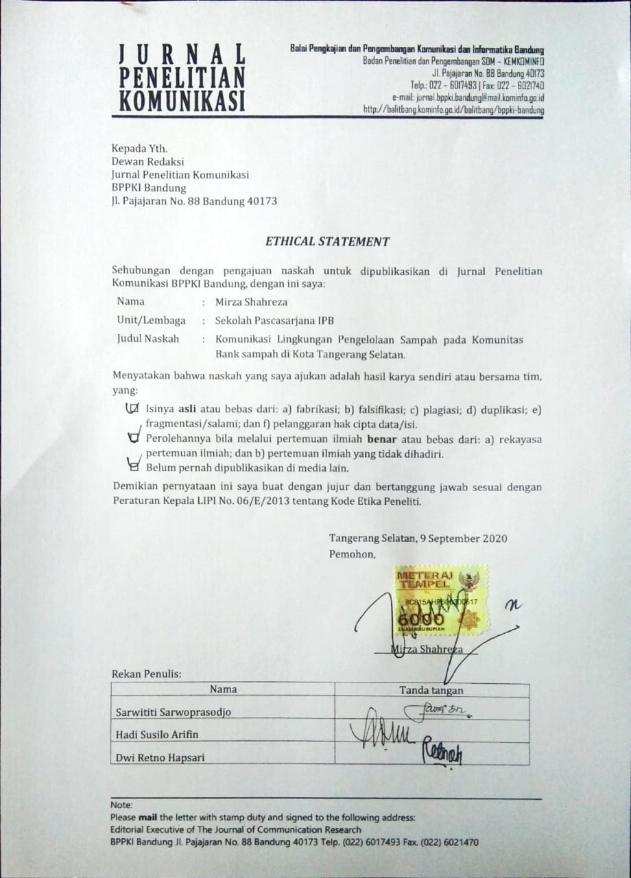Penelitian ini bertujuan untuk menggambarkan komunikasi lingkungan pengelolaan sampah pada bank sampah di antara pemangku kepentingan di Kota Tangerang Selatan. Penelitian ini menggunakan pendekatan deskriptif kualitatif dengan perolehan data melalui observasi dan wawancara mendalam. Analisis data dilakukan dengan strategi explanation buildings, di mana peneliti mencoba mengonstruksi penjelasan tentang kasus dengan membuat pernyataan terkait fenomena yang diteliti. Hasil penelitian menggambarkan bahwa proses komunikasi lingkungan pada pengelolaan sampah di komunitas bank sampah antara pemangku kepentingan pendukungnya mempertemukan tiga kepentingan yaitu, pemerintah (Dinas Lingkungan Hidup), pengepul, dan komunitas bank sampah. Ketiga pemangku kepentingan tersebut akhirnya membentuk model komunikasi konvergen saling pengertian dan saling ketergantungan yang memosisikan bank sampah sebagai isu publik dalam pengelolaan sampah.